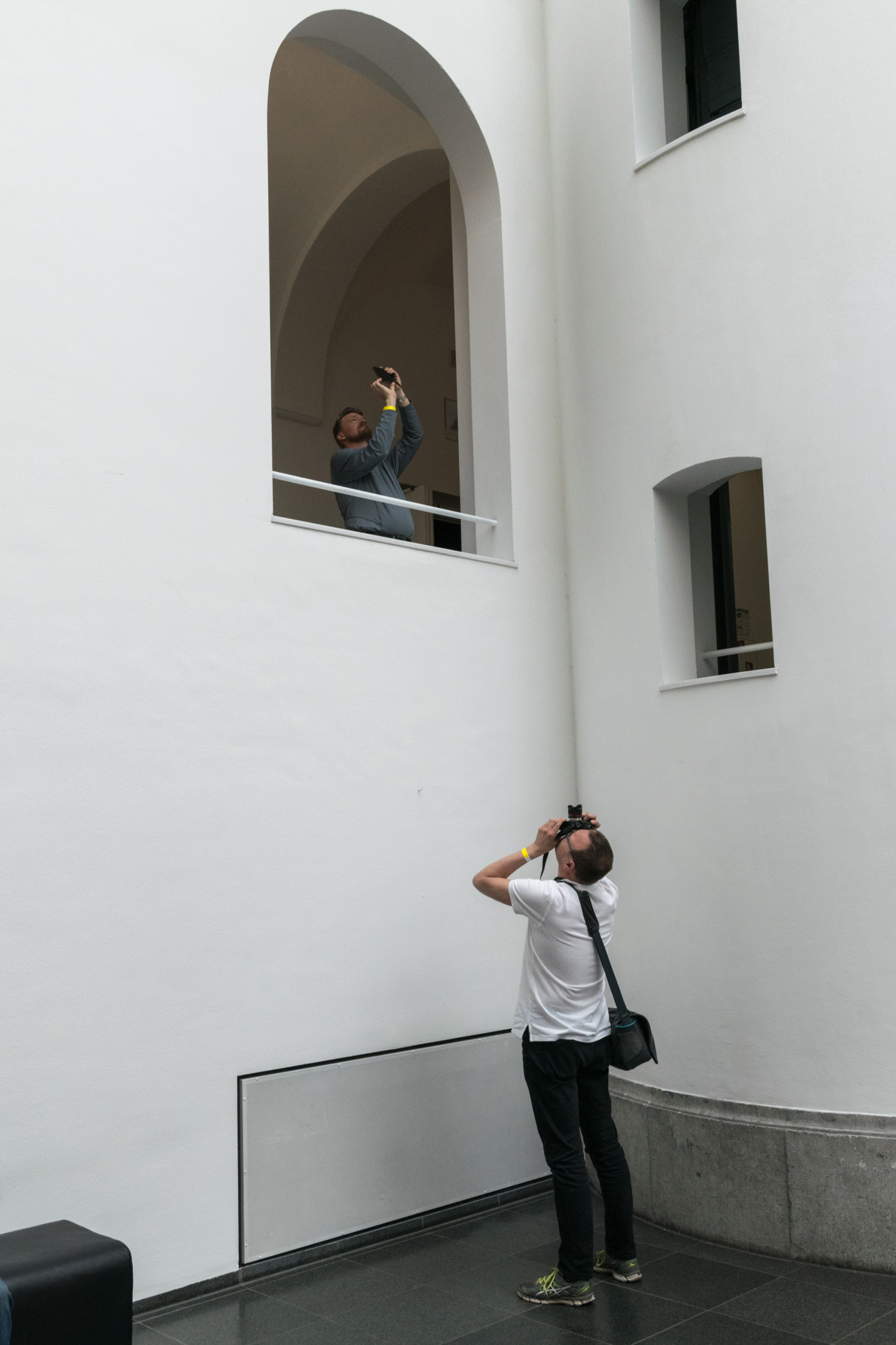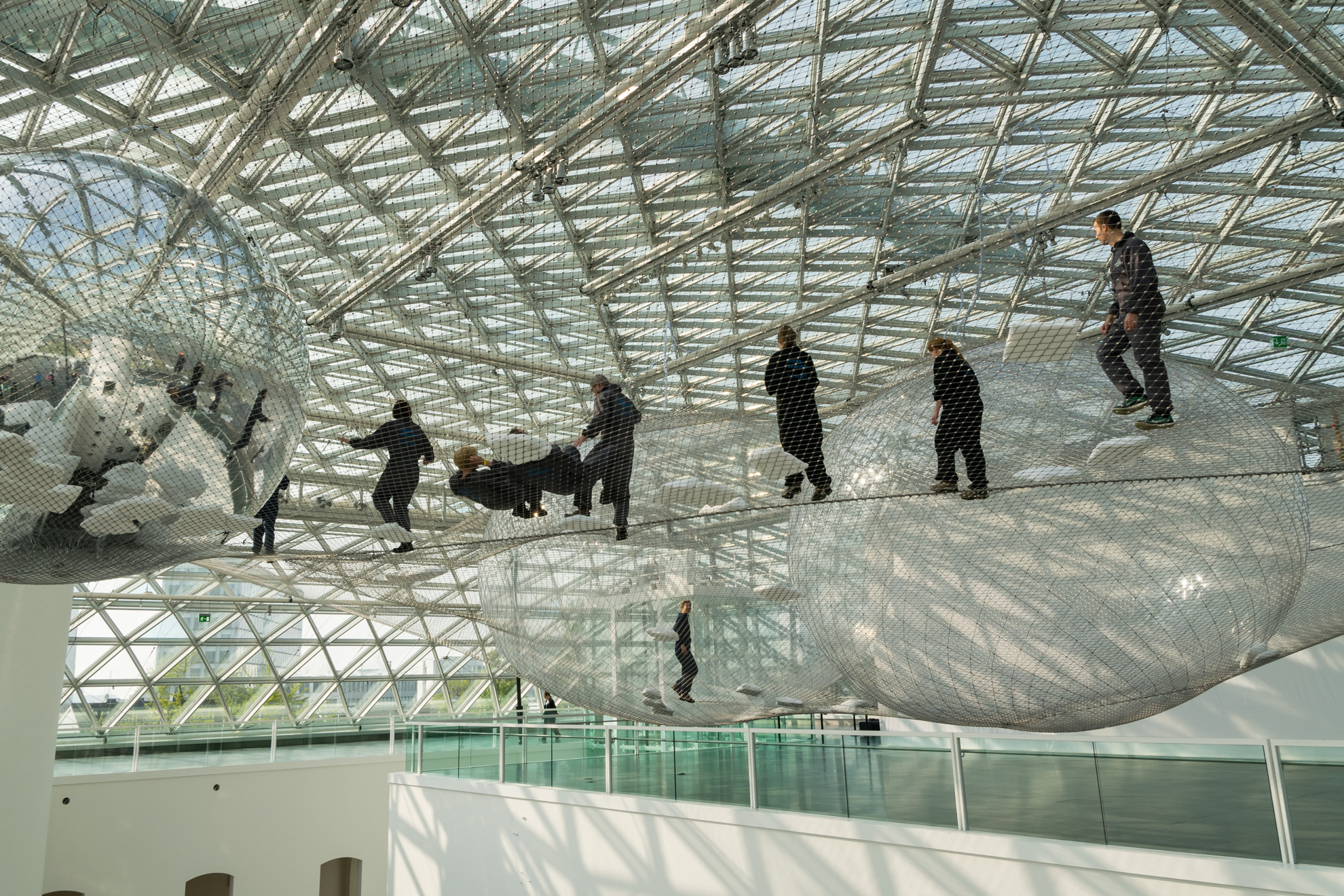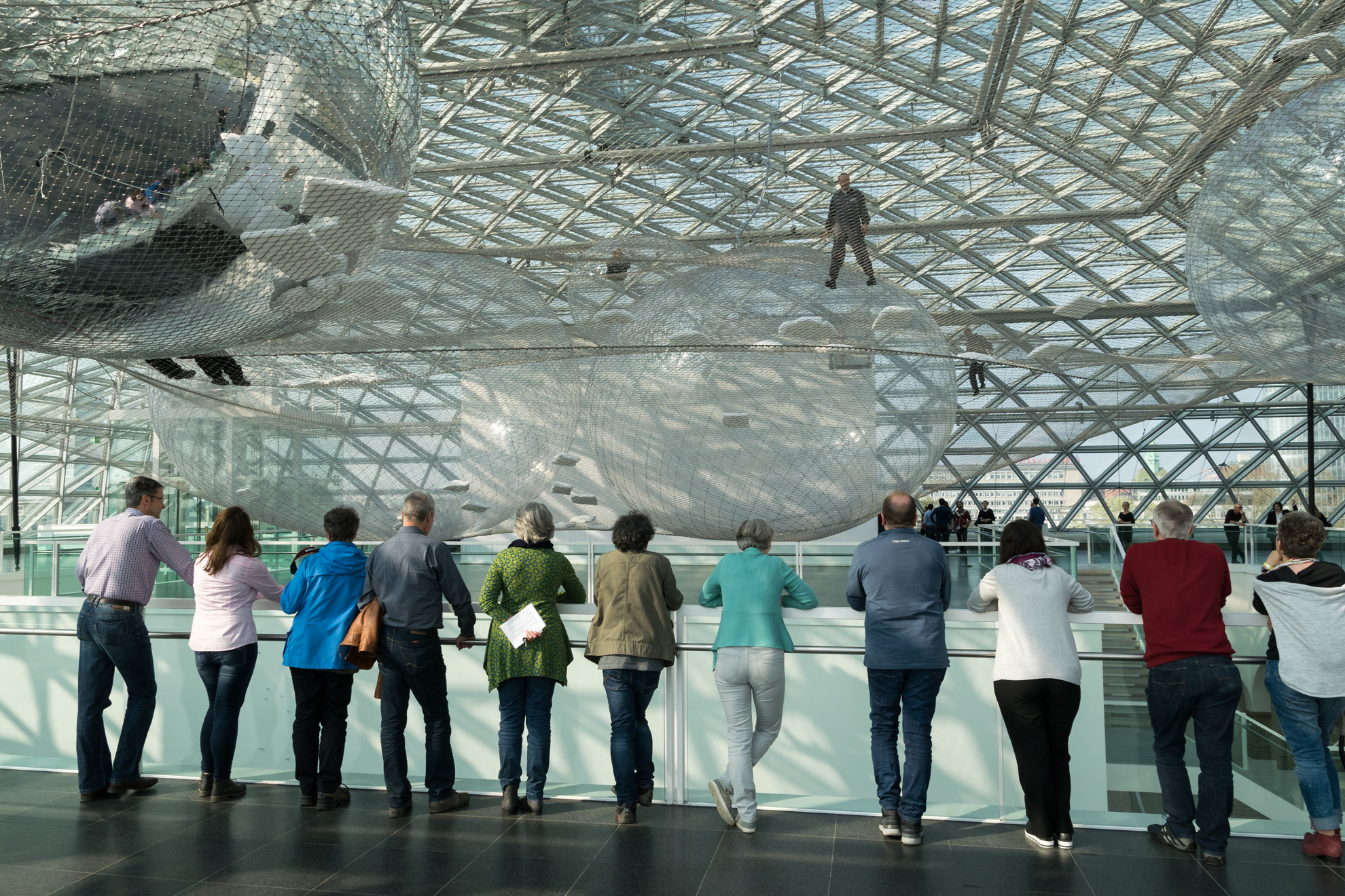 Die Kamera wieder in der Hand, wird das Museum von oben bis unten „abgearbeitet“. Irgendwo sieht irgendwer immer wieder etwas, das er in Szene setzen möchte. Die Menschen, die sich jetzt im Netz befinden, die angestrahlten Decken, Treppenaufgänge, Geländer, aber auch Besucher, die scheinbar ins Nichts gucken, wenn sie die Mutigen weit oben im Netz beobachten. Auch im Außengelände, das einen See beherbergt, können schöne Bilder gemacht werden. Jogger im Licht der Frühlingssonne, ein brütender Schwan oder auch eine Braut, die sich mit ihrem Mann für ihr Fotoshooting vorbereitet.