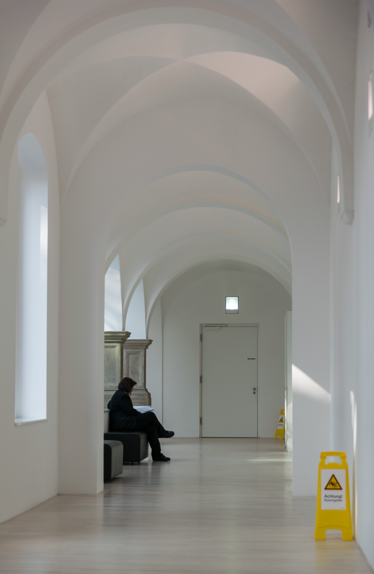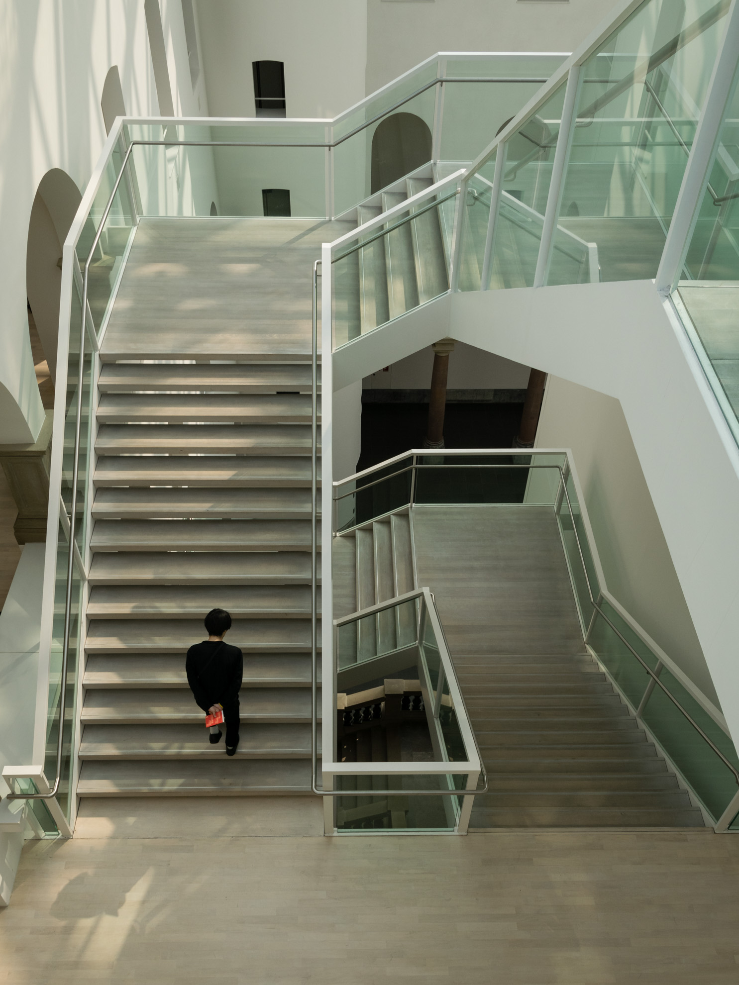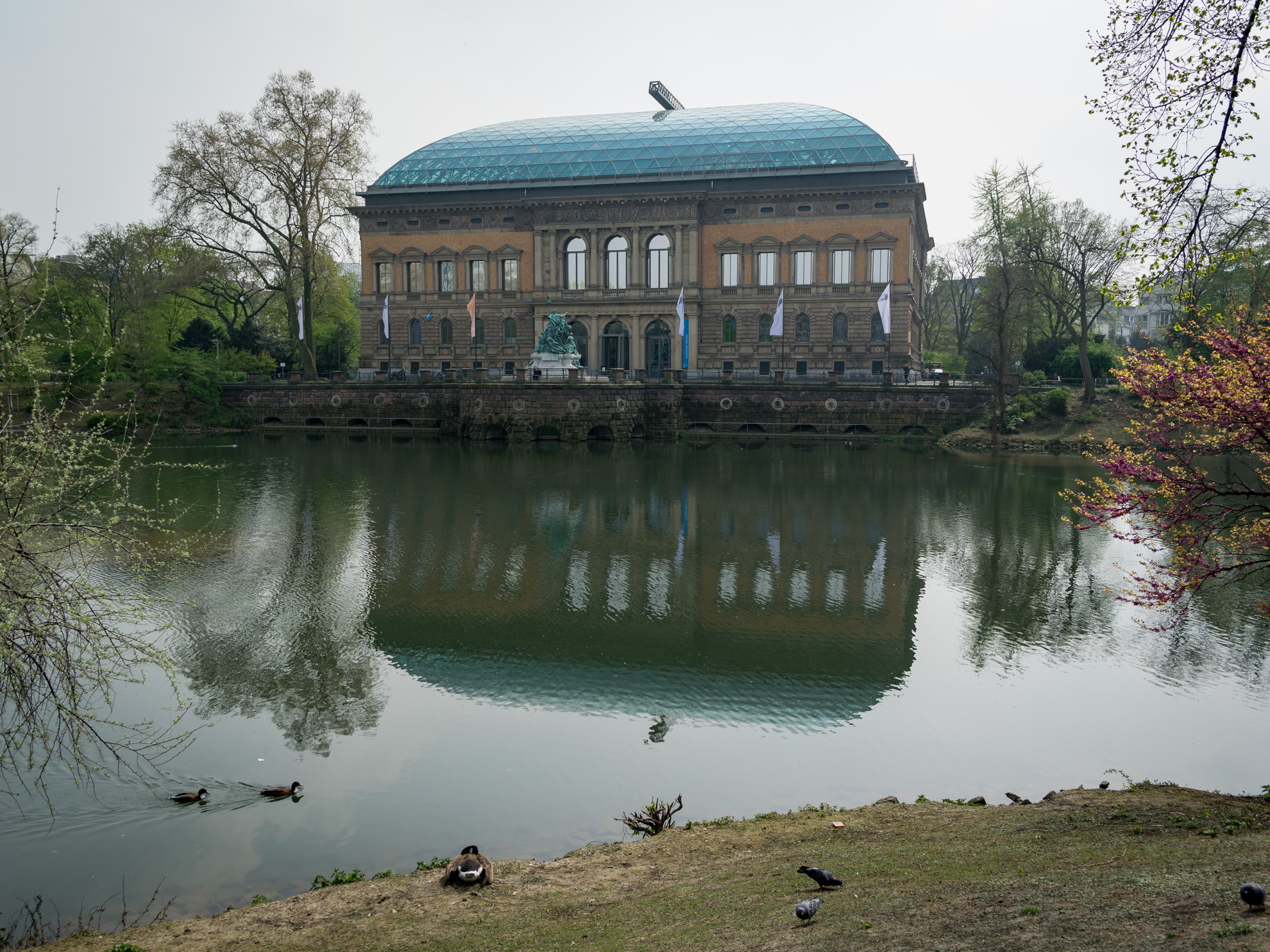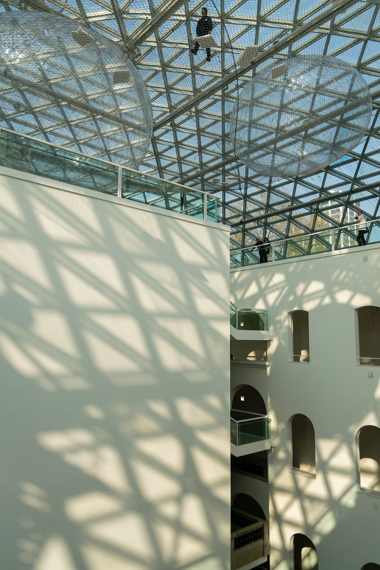 Die Kamera wieder in der Hand, wird das Museum von oben bis unten „abgearbeitet“. Irgendwo sieht irgendwer immer wieder etwas, das er in Szene setzen möchte. Die Menschen, die sich jetzt im Netz befinden, die angestrahlten Decken, Treppenaufgänge, Geländer, aber auch Besucher, die scheinbar ins Nichts gucken, wenn sie die Mutigen weit oben im Netz beobachten. Auch im Außengelände, das einen See beherbergt, können schöne Bilder gemacht werden. Jogger im Licht der Frühlingssonne, ein brütender Schwan oder auch eine Braut, die sich mit ihrem Mann für ihr Fotoshooting vorbereitet.