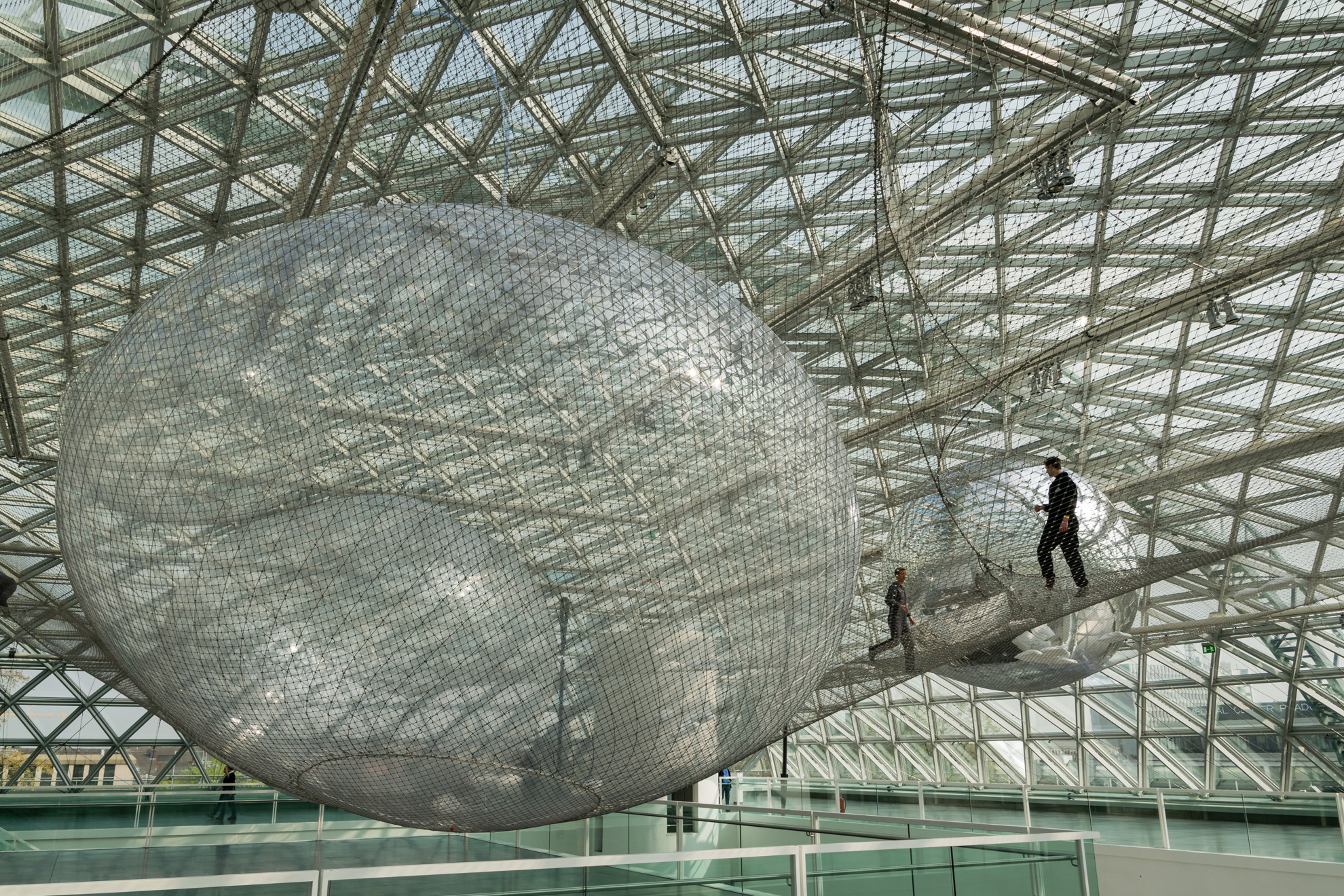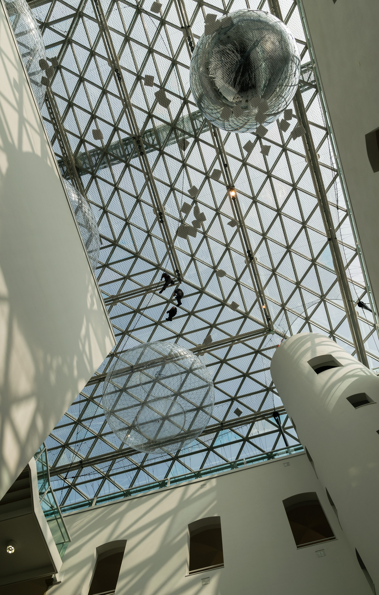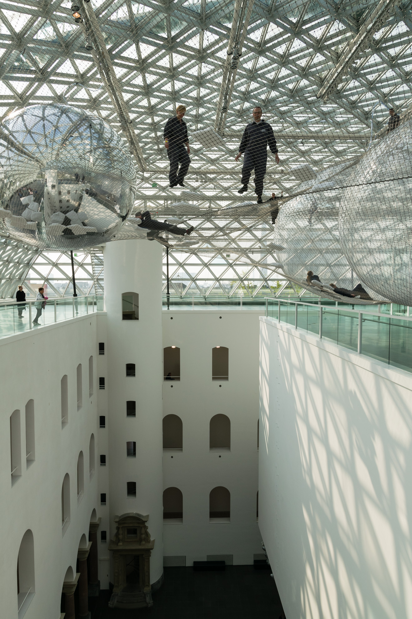 Auf nach Düsseldorf …. Dieses Mal fahren wir ins K21 – ein architektonischer Leckerbissen mit seinen im Inneren wunderschönen Säulen, den weiß geputzten Wänden und der großen Glaskuppel. Genau unter dieser kann man auf 2500 m² Stahlnetz scheinbar schwebend in einem nachempfundenen Spinnennetz krabbeln. Ein direkter Blick nach unten lässt einen schon kurz schlucken, aber in Vertrauen auf das Material geht es dann weiter…. gehend, krabbelnd und liegend. Ca. 10 Minuten darf man „in orbit“ verweilen, bevor man sich wieder auf standfesten Boden begeben muss.